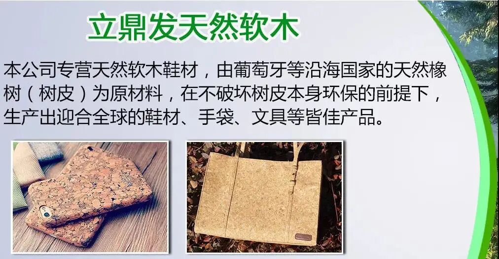 立鼎发软木有限公司,成立于2004年,至今已发展成加工、生产、销售为一体的多元化经营企业。本公司专营天然软木鞋材,由葡萄牙等沿海国家的天然橡树(树皮)为原材料,在不破坏树皮本身环保的前提下,生产出迎合全球的鞋材、手袋、文具等皆佳产品。